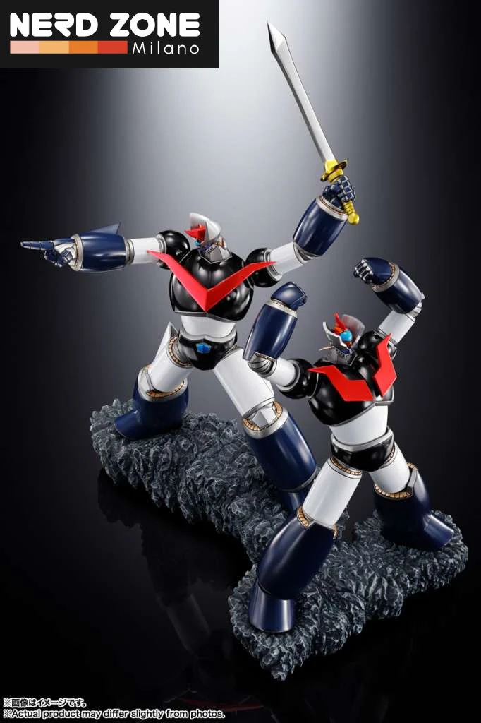 I dettagli di pregio non passano inosservati: le piastre rosse sul petto, la spada di Great Mazinger con lama argentata e impugnatura dorata, e la leggendaria Mazinger Blade, tutti impreziositi da una raffinata finitura metallica placcata che valorizza ulteriormente il set.